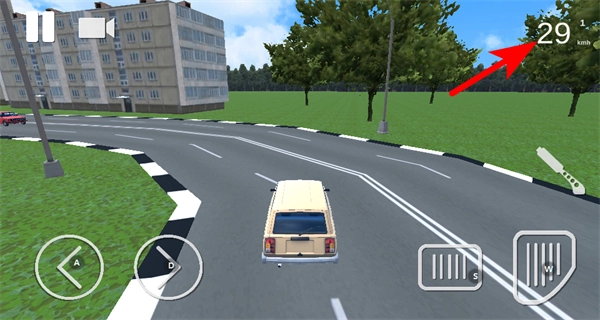 进入驾驶界面后,我们可以借助油门键来操控车辆,右上角会显示当前车速(例如29km/h),还能自由调整方向和油门以控制行驶状态。