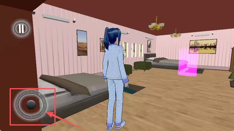 看卧室场景,点击床边灰色内圈的操作按钮,这个按钮或许是用来起床或开启新一天活动的。