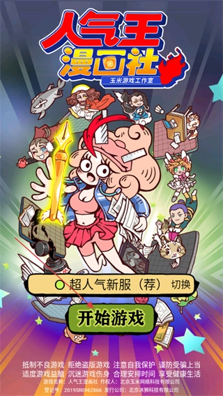 1、这是人气王漫画社的游戏启动界面,选择超人气新服后点击开始游戏按钮,即可进入该游戏。