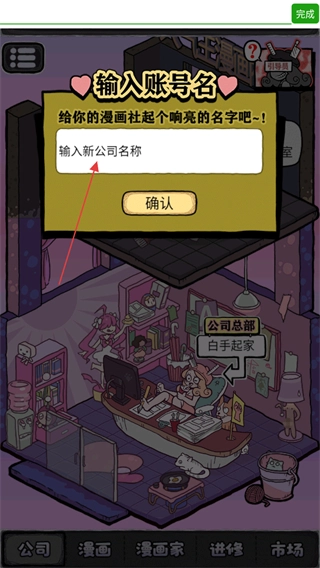 3、在游戏的初始环节,需在输入框中填写漫画社名称,完成后点击确认按钮,即可进入游戏主界面。