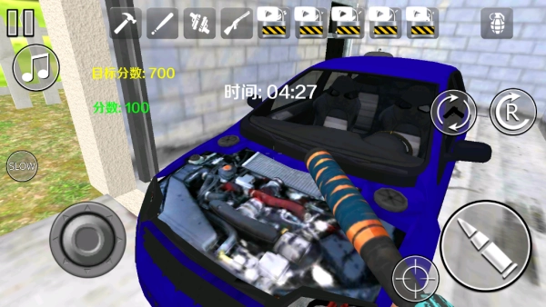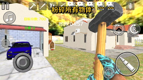 点击画面中央偏右的武器图标,就能切换不同道具来进行破坏。当本关卡的得分达到设定的700分,即可成功通关。
