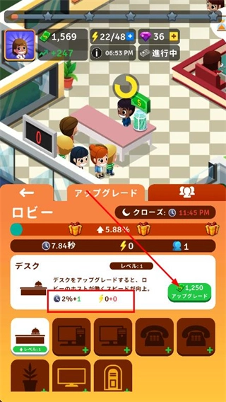 2、进入升级界面,消耗资源升级设施,可提升餐厅的服务能力和收益效率。