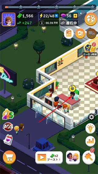 1、点击前台区域,顾客用餐后会产生收益,不断积累收益用于餐厅发展。