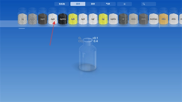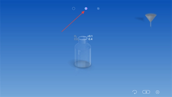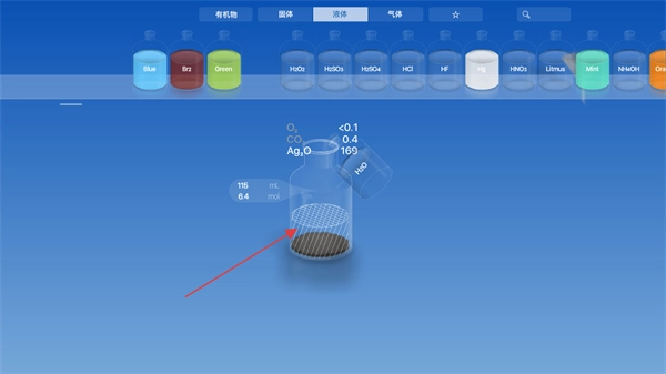 1、打开虚拟化学实验室游戏,点击上方中间的圆点打开化学用品选项。