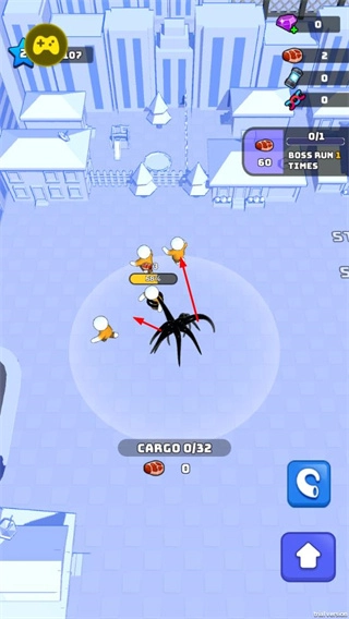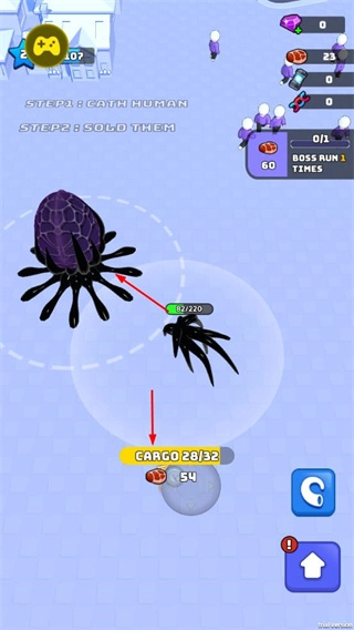 1、操控毒液在雪地城市场景里移动,抓捕人类并将其装入cargo中,以此扩大收集的规模。