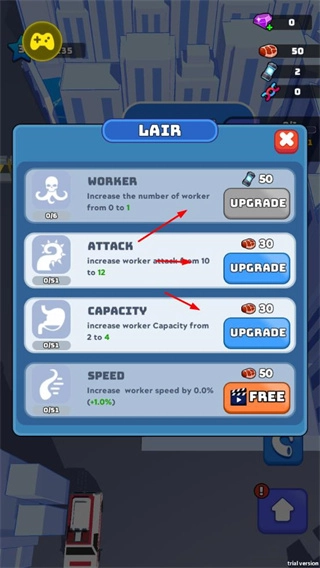 4、提升工人的数量、攻击能力、负载容量、移动速度等属性,以此提高毒液的收集效率并增强整体运作性能。