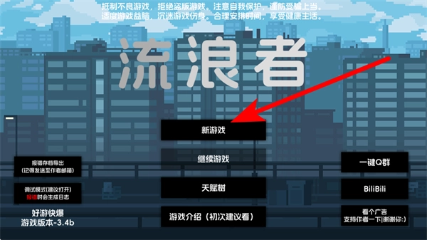1、进入游戏界面后,点击新游戏开启流浪者的生存冒险,这是进入游戏的关键操作,准确点击可解锁场景交互、资源拾取等玩法环节。