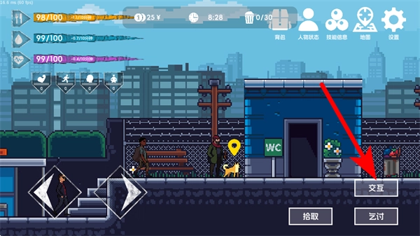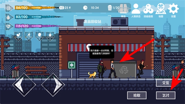 4、在遇到NPC或可乞讨的场景时,点击乞讨按钮获取金钱或物资,补充生存资源,助力在城市中持续生存,提升流浪者的生存状态。