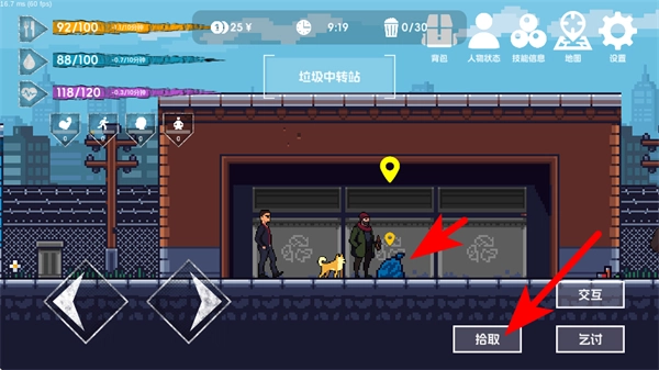 2、在游戏场景中,点击交互按钮与场景元素如垃圾桶、NPC互动,获取生存线索或资源,这是探索场景、积累生存资本的重要方式。