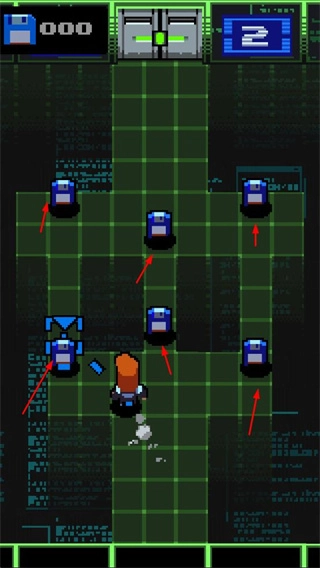 在网格地图里收集蓝色设备,以此获取资源或者解锁新的区域,与此同时还要避开敌人。