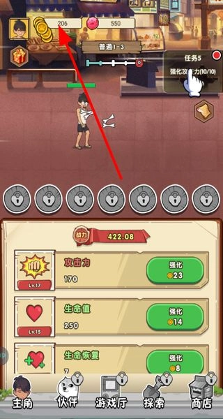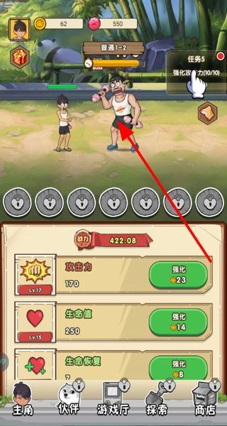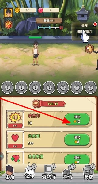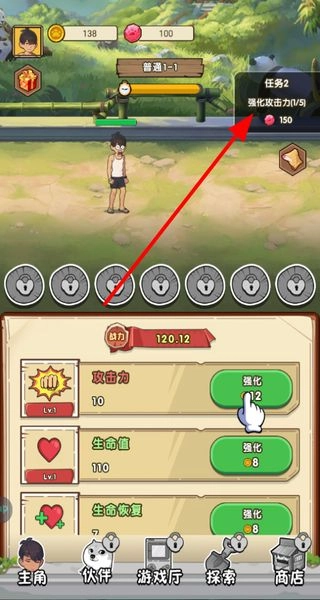 1、消耗金币强化攻击力,提升角色攻击能力,助力战斗,强化所需金币数量会有提示。