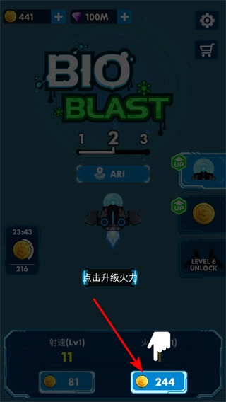 1、升级火力系统,点击升级火力按钮,消耗金币提升飞船的火力,增强对敌人的伤害输出,优化战斗能力。