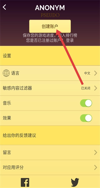 2、在游戏设置界面,点击创建账户按钮,进入注册界面。