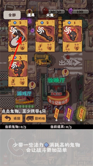 1、在鬼物选择界面,点击卡牌即可将对应鬼物编入队伍,队伍中至少需携带4只鬼物才能出发,这是冒险前的基础准备步骤。