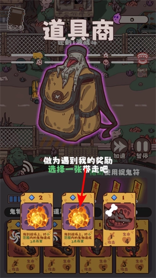 4、当你遇到道具商时,可以挑选一张道具卡牌带走,这些道具在战斗里能派上用场,帮助你提高战斗的胜率。