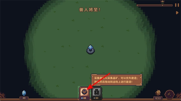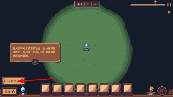 1、开启战斗流程,点击开始战斗按钮,进入战斗场景,开始抵御兽人的攻击,保护水晶。
