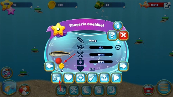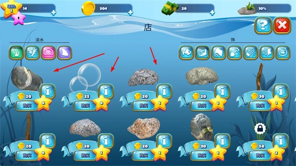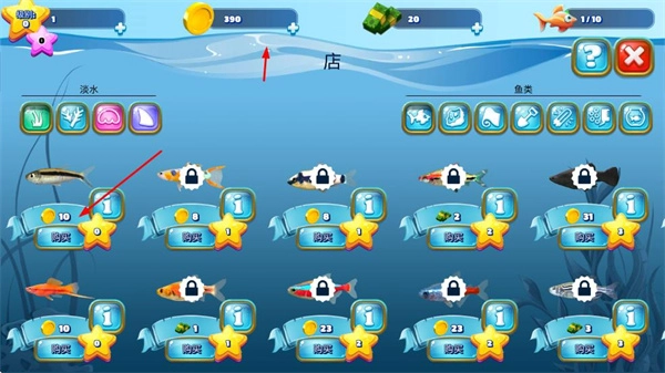 1、进入商店用金币购买各类淡水鱼,这是开启养鱼之旅的关键步骤,能让鱼缸里的鱼类更加丰富。