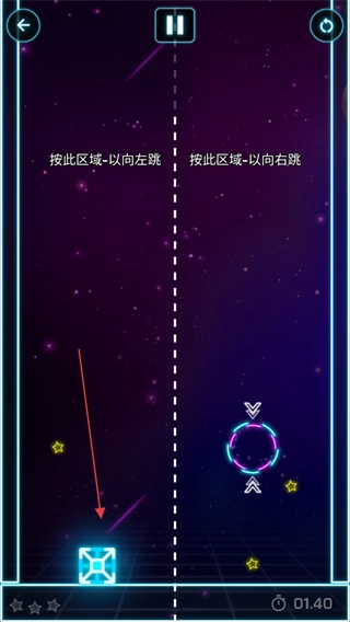 2、借助右侧的跳跃区域来操控方块向右跳跃,避开障碍的同时收集星星。