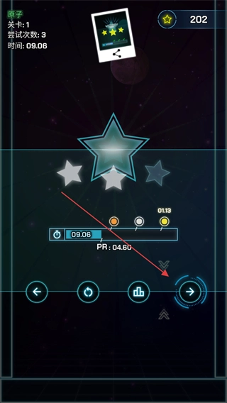 完成关卡后,可查看该关卡的尝试次数、用时等信息,点击箭头即可进入下一关。