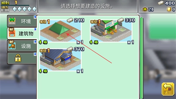 4、在建造页面里,你能够挑选环境、建筑物以及设施这几类不同的选项,而且搭建的每一个建筑都需要消耗金钱。