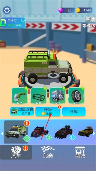 1、可以消耗金币对赛车的各类组件进行升级,以此提升赛车性能,为比赛提供助力。