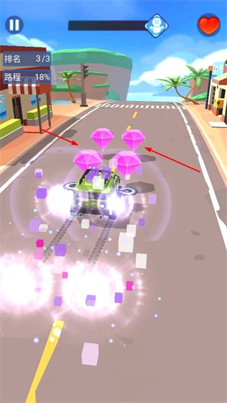 在比赛赛道上,驾驶赛车收集钻石之类的道具,积累资源。
