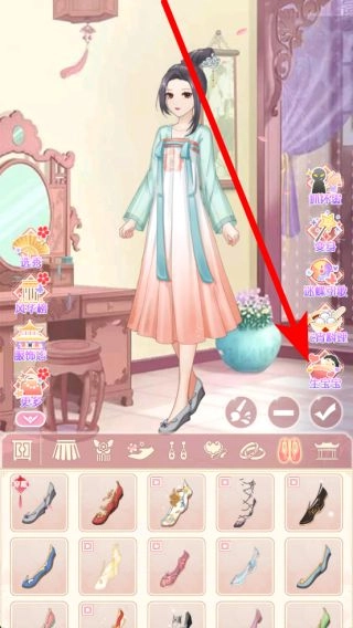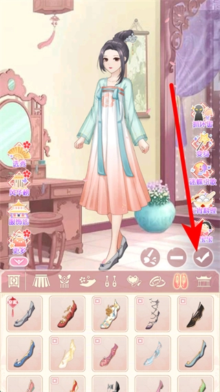 1、选好鞋子等服饰部件后,点击对勾按钮,即可确认当前的搭配选择,完成一次古风装扮的设定,以便进入相应场景或活动。