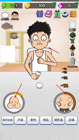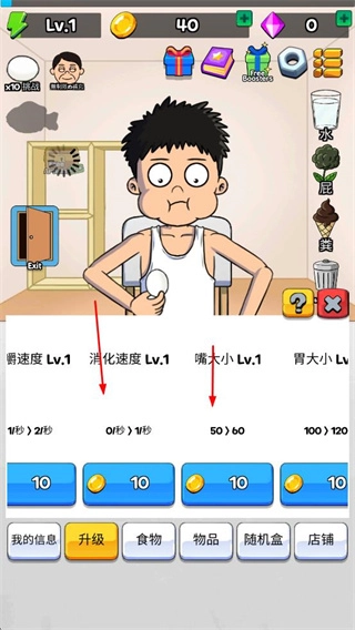 2、使用金币可以升级咀嚼速度、消化速度、嘴巴大小、胃部容量等属性,以此增强角色在进食方面的各项能力。
