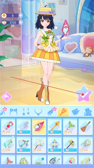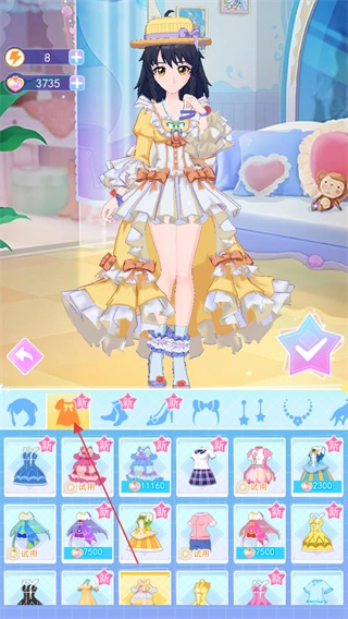 1、进入游戏换装界面,查看左侧的等级8和货币数量3735,点击下方服装分类中的衣服,给角色试穿。