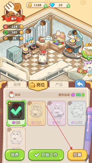 1、打开游戏进入餐厅店铺内部,点击右下角的岗位进行员工调整。
