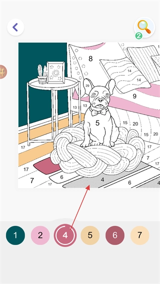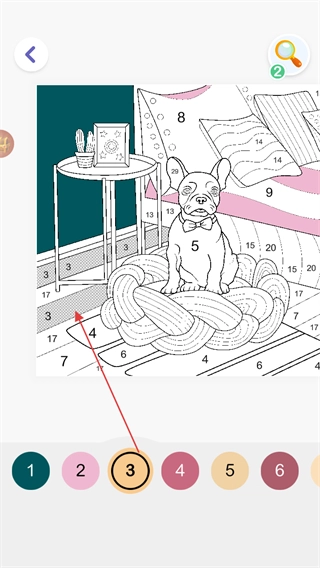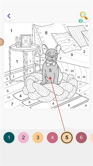 4、点击数字5,为小狗身上标有5的区域涂色,逐步完成图案的填充。