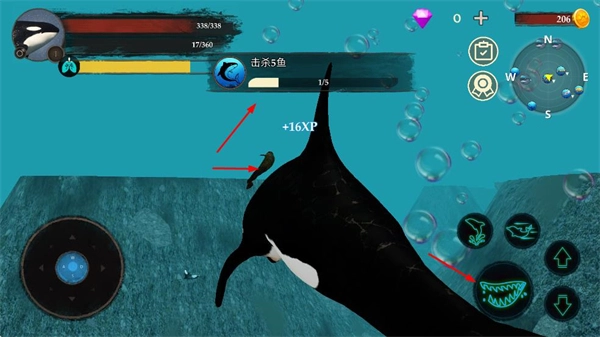 2、操控海洋生物在海域内游动,探索各个区域,搜寻猎物和任务目标。