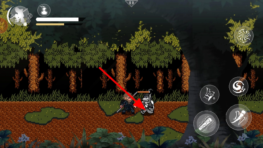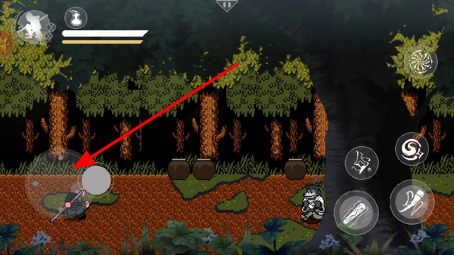 1、操控角色在森林里移动,借助操作按钮来调整角色的位置和行动方向,探索冒险场景,为之后遇到敌人以及进行互动做好准备。