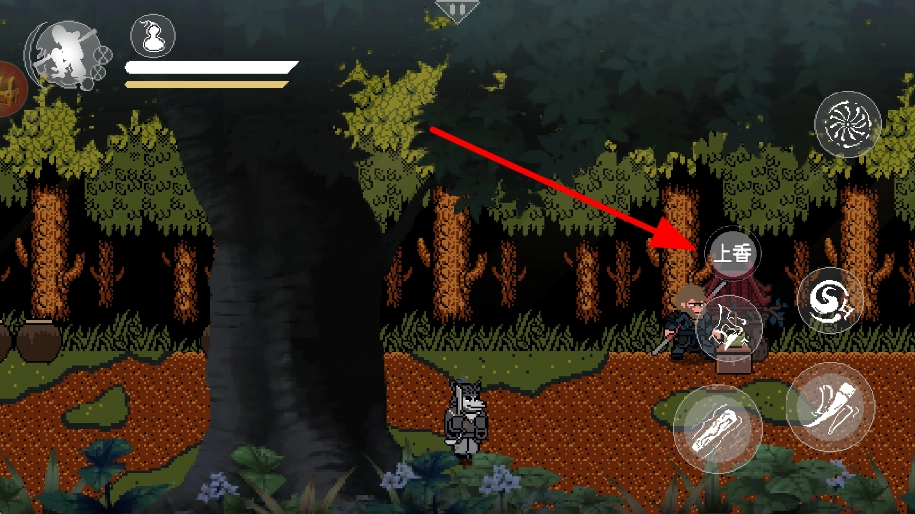 3、冒险途中要是角色血量不够了,就去寻找可以上香的地方,通过上香的方式来恢复角色的血量,这样就能让角色继续冒险了。