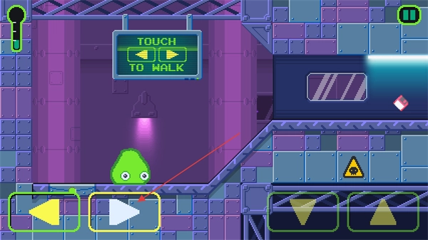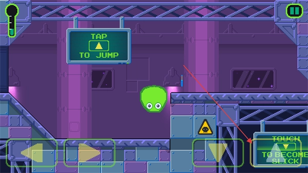 3、点击跳跃按钮,使粘液角色跃过障碍,在此过程中能够触发TOBECOMESTICK功能,从而附着在墙面上移动。