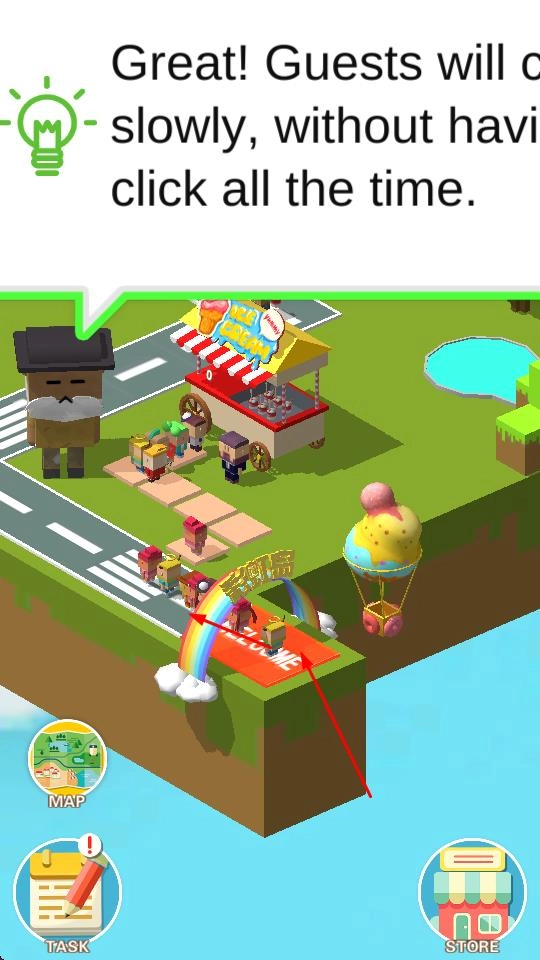 1、乐园里会有客人自动慢悠悠地前来,不需要一直点击操作,能让玩家管理起来更省心。