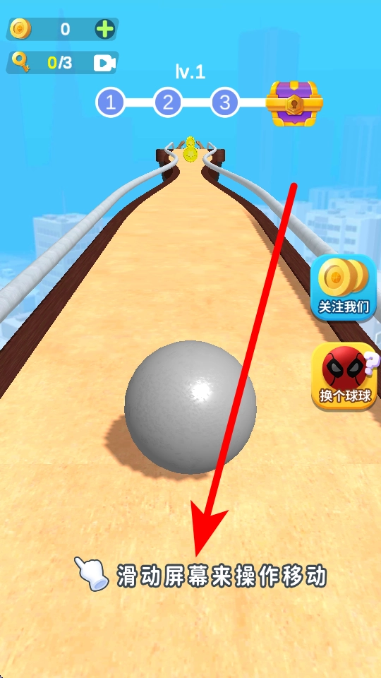 1、进入游戏后,按照提示滑动屏幕,可操控小球在赛道上左右移动,借此调整小球的位置,避开赛道两侧的护栏等障碍物。