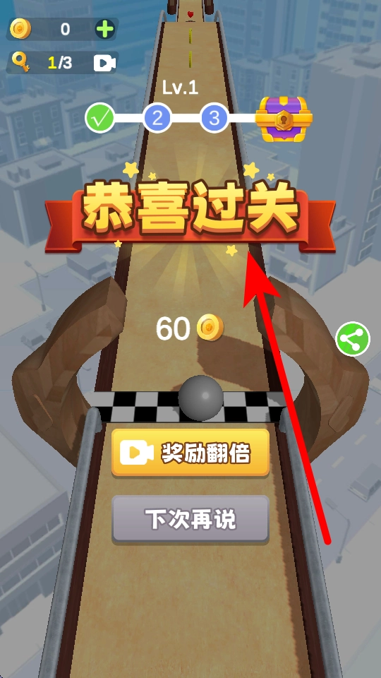 4、当小球到达终点线时,即可顺利通关,通关后会展示奖励,并且可以选择是否将奖励翻倍。