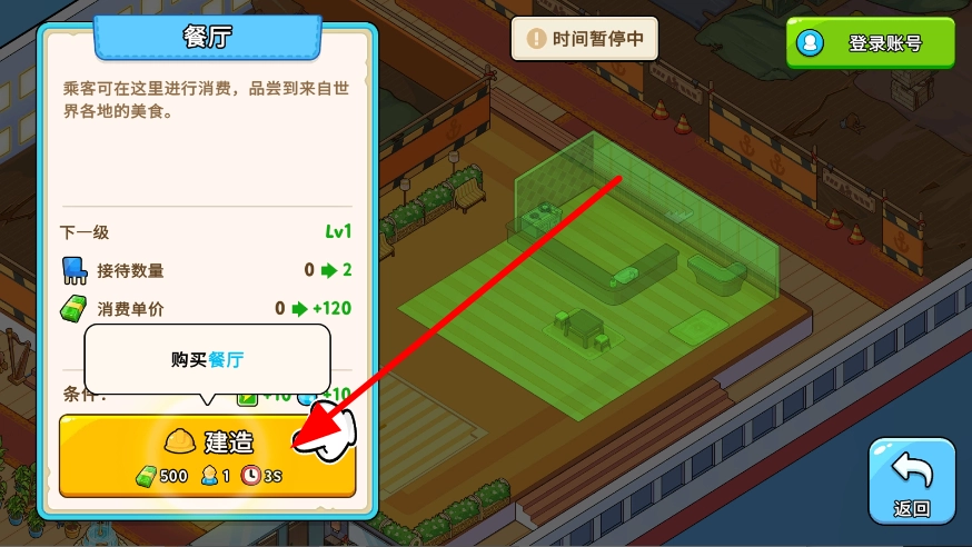 进入游戏后,你可以建造餐厅之类的设施,点击建造按钮,消耗对应的资源,打造出可供乘客消费的场所,以此为后续的经营活动做好准备。