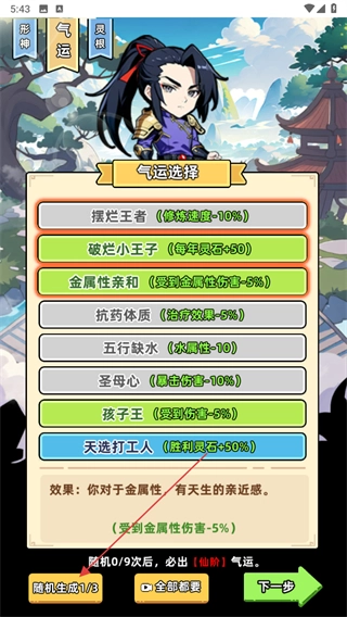 2、接下来继续进行气运的选择,要是列表里没有高等级的气运,就可以点击下方的随机生成按钮来刷新列表。