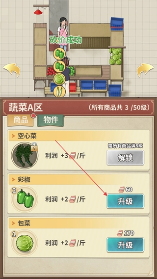 1、点击菜市场的摊位,挑选商品,再点击升级按钮来提升菜品的利润。