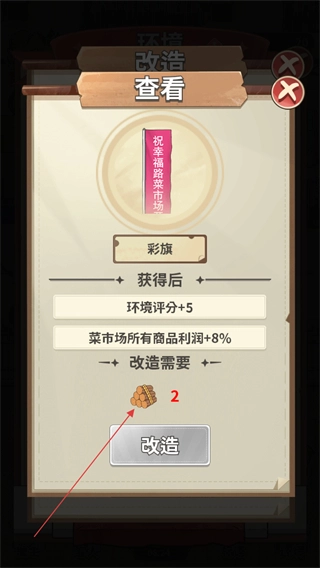 4、通过查看建筑界面,能够了解该建筑可为市场带来的加成效果,以及进行改造所需的材料要求。