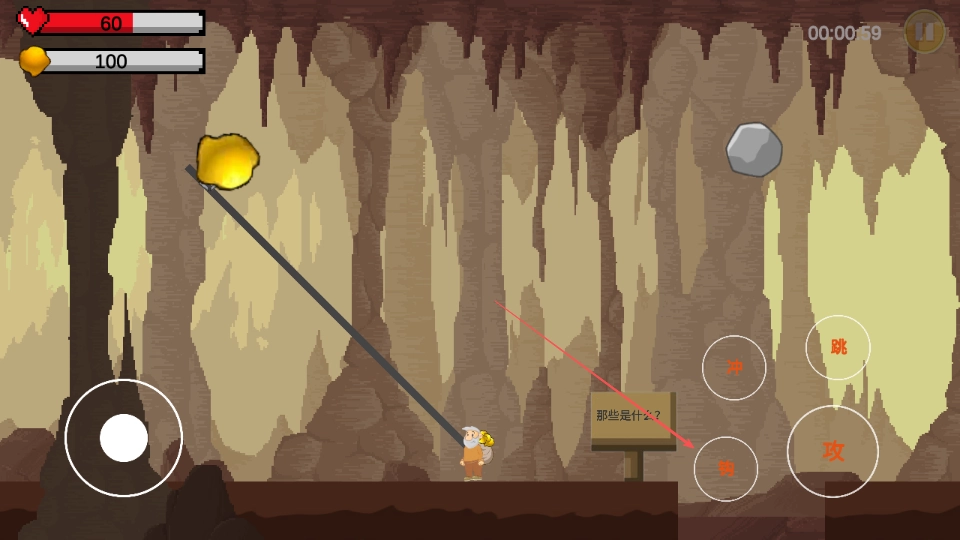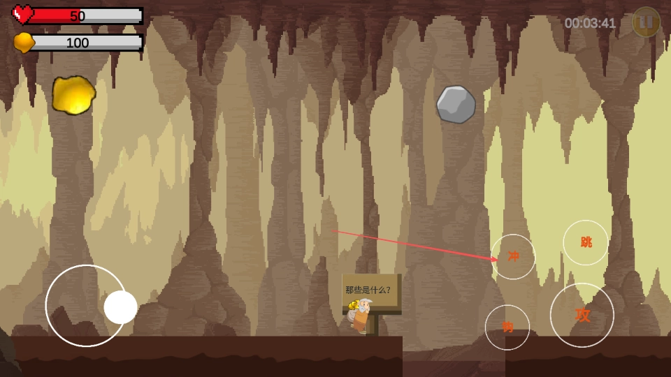 3、遇到危险或需要快速移动时,点击冲按钮冲刺,点击跳按钮进行跳跃躲避障碍。