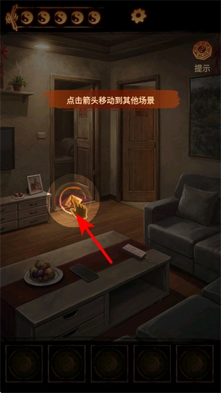 2、点击场景内的箭头交互按钮,切换至其他场景区域,逐一探索客厅、卧室不同空间可交互元素。