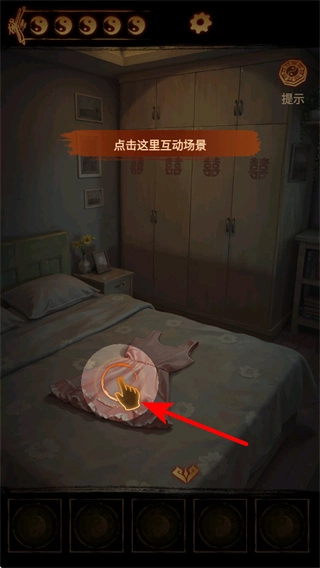 3、定位场景中的交互点如卧室床铺处,点击后触发道具拾取操作,获取场景内的关键物品。