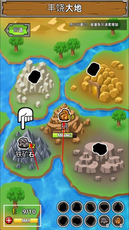 1、在丰饶大地场景里,玩家能够开展采矿活动,收集铜、铁矿石这类资源,点击画面还可以提升能量的恢复速率。