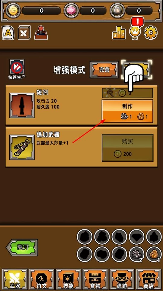 2、打开锻造界面,使用采集获取的资源打造武器,比如打造攻击力20、耐久度100的短剑,还能购买额外的武器。