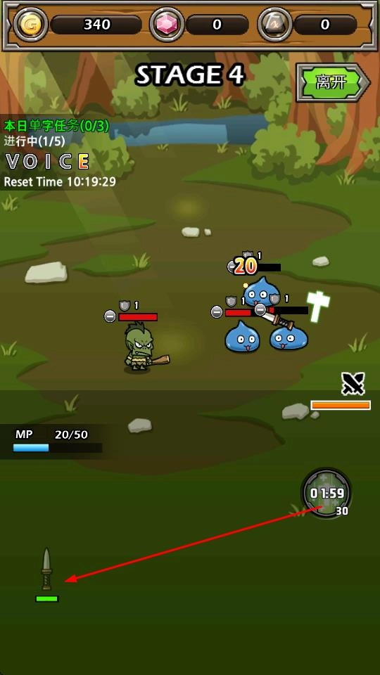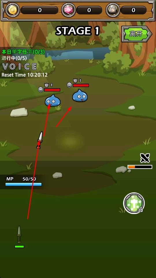 3、在战斗关卡里,你需要操控角色,用已经制作完成的武器去攻击敌人,像蓝色史莱姆、手持武器的绿色敌人之类的都在此列。