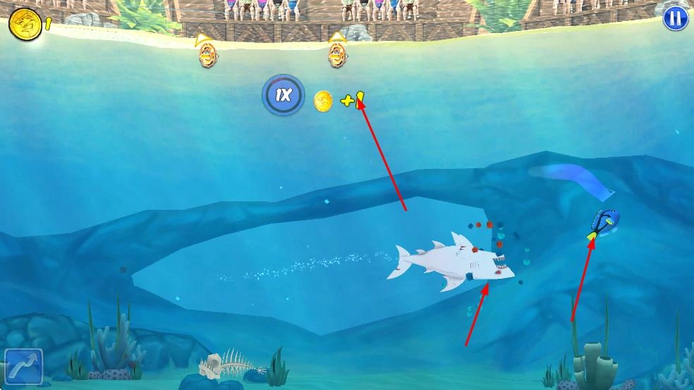 1、在水下场景里操控鲨鱼游动,攻击小鱼之类的海洋生物,就能得到金币奖励,以此积累资源。