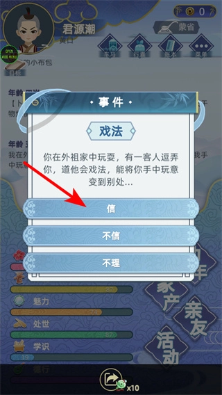 1、当游戏页面出现戏法事件时,点击“信”并选择对应的操作是推动剧情发展的关键步骤,完成这一选择后,便能触发后续与戏法相关的情节,从而丰富角色的人生经历。
